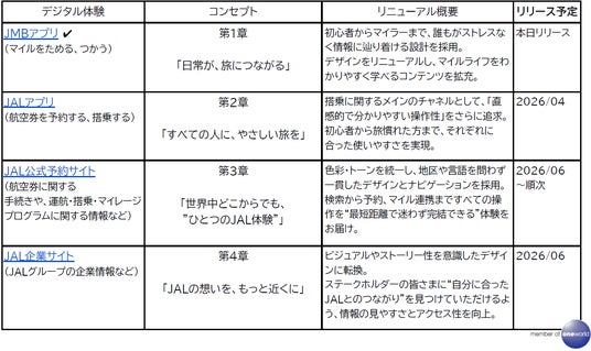 第一章として「JALマイレージバンクアプリ(JMBアプリ)」を皮切りに、2026年4月以降は、「JALアプリ」「JAL公式予約サイト」「JAL企業サイト」のリニューアルを順次予定しています。