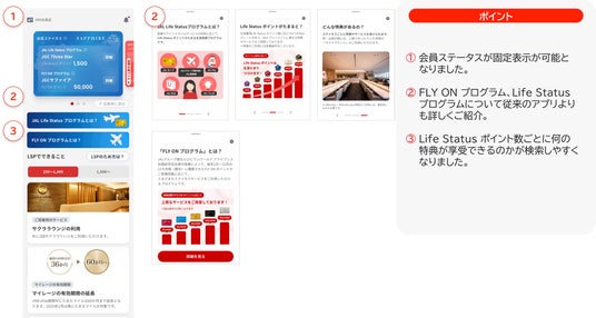 お客さまからの「JAL Life StatusプログラムやFLY ONプログラムなど、会員ステイタスの仕組みが分かりにくい」という声を反映し、従来のアプリに比べて会員ステイタスに関する情報が充実しました。