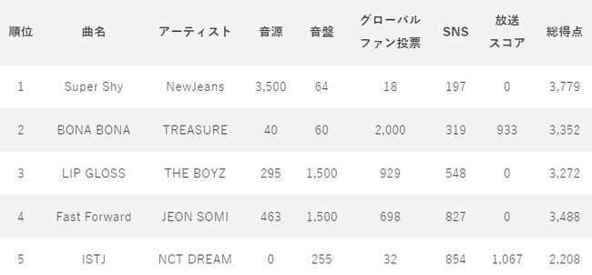 (※)各スコアの割合音源35%、音盤15%、グローバルファン投票(アプリ)20%、SNS10%、放送スコア20%