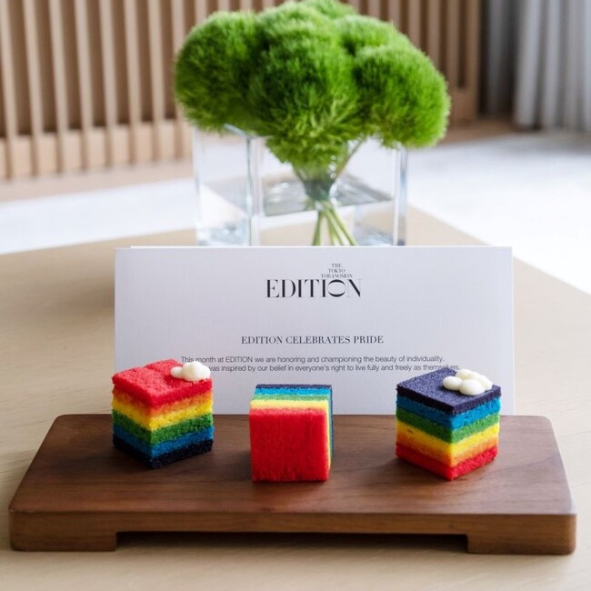 6月1日(木)~7日(水)、21日(水)~30日(金)の期間には、ご宿泊のゲストに「Rainbow Cake」のアメニティをご用意します。このアメニティは、誰もが自分らしく自由に生きる権利を持つという信念から生まれました。虹をイメージしたキューブケーキに雲を模ったフロスティングクリームをトッピングし、6色6層のそれぞれ異なるフレーバーがハーモニーを奏で、個性の美しさを称えます。