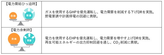 本サービスは、TGESが、スマートマルチを電力の需給バランス等に応じて自動で遠隔制御するものです。追加設備の導入や特別な操作・作業を必要とせず、空調の快適性を維持したまま、調整力を創出します。具体的には、電力需給ひっ迫時等においてはGHPを優先的に運転する「下げDR」、電力余剰時等においてはEHPを優先的に運転する「上げDR」を行うことで、需給バランスの調整に貢献するとともに、DRの実績に応じた報酬を得ることができます[*3]。