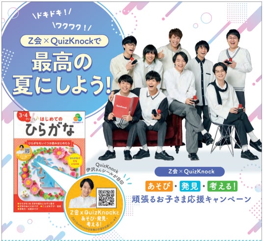 株式会社増進会ホールディングス(Z会グループ)のグループ会社、株式会社Z会ソリューションズは、株式会社batonが運営する知識集団「QuizKnock」と協力して、夏休みに頑張るお子さま達を応援するキャンペーンを2025年7月10日(木)~8月31日(日)の期間に実施します。対象書店にて、QuizKnock伊沢さんが目印の特製シールが貼られた「Z会の幼児ワーク」シリーズを購入いただいた方には、オリジナルグッズを提供いたします。また、購入者限定で、QuizKnockのサイングッズが抽選であたるキャンペーンも実施! ぜひふるってご参加ください。