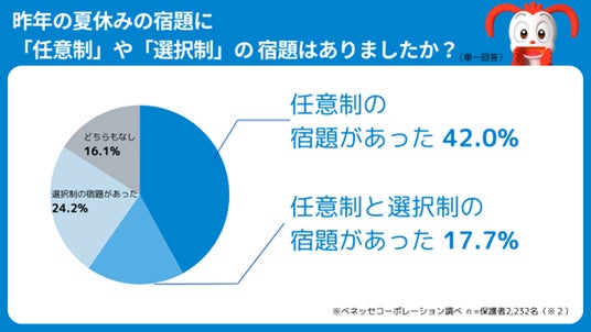 これまで、学校から出される夏休みの宿題はすべてやるものという前提でした。今回の調査では「やってもやらなくてもいい」任意制の宿題があると回答した方が全体の42.0%、「出されたものから選ぶ」選択制の宿題があると回答した方が24.2%、「やってもやらなくてもいいかつ、出されたものから選ぶ」任意制と選択制の宿題がある方が17.7%でした。