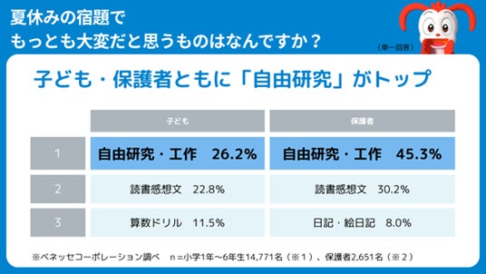 株式会社ベネッセコーポレーション(本社:岡山県岡山市、代表取締役会長兼社長:岩瀬大輔)が提供する通信教育講座「進研ゼミ 小学講座」は、全国の小学1年生~6年生16,741名(※1)と保護者2,803名(※2)に夏休みの宿題に関する調査を実施しました。