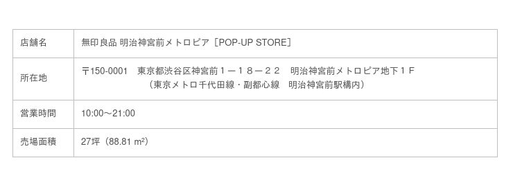 株式会社良品計画(東京都豊島区/代表取締役社長 堂前宣夫)は、自然の力を最大限に生かした商品を集めたPOP-UP STORE「無印良品 明治神宮前メトロピア」を一年間限定で3月10日(金)にオープンいたします。