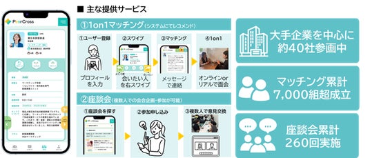 「PeerCross」は、安心・安全に社内外問わず、価値観境遇の近い複数人の身近なロールモデルとの出会いを通じてキャリアに対して利用者の前向きな意識変容・行動変容を起こす企業向けキャリア形成支援サービスです。