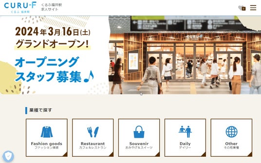 「くるふ福井駅」は北陸新幹線延伸予定の福井駅の新たな商業施設として3月16日に開業を予定しています。アイデムはこれまでも様々な商業施設における、出店企業向けスタッフ募集サイトや、合同求人特集号の発行など、スタッフ採用活動に関するサポートを行ってまいりました。そういった過去の実績により今回の採用支援を受託しスタッフ募集サイトの構築や運営に加え、各種求人企画をワンストップで行い、各出店企業の負担軽減に寄与するとともに、就業を希望される求職者の応募意欲を高め、地域の活性化を目指します。