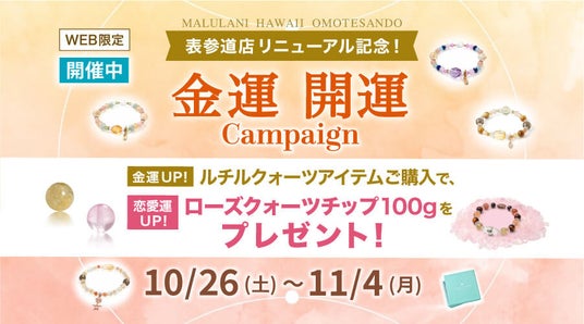 ハワイ発パワーストーンブランドマルラニハワイにて、表参道店のリニューアルオープンを記念して、ローズクオーツチップをプレゼントするキャンペーンがスタートしました。