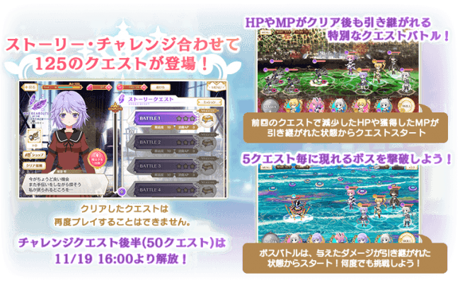 ストーリークエスト・チャレンジクエスト合わせて、125のクエストがありクエストクリア時の魔法少女のHPやMPが、次回のクエストへ引き継がれる特別なクエストバトルを楽しむことができます。