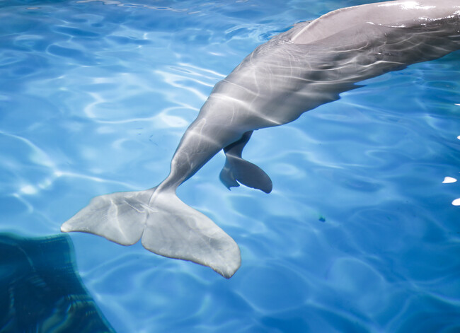 2023年9月18日の17時13分に母獣「ミリー」の破水を確認し、約6時間45分後の23時58分に出産しました。飼育員が固唾を飲んで見守る中、赤ちゃんはすぐに自力で泳ぎ始めて水面へと上がり、元気いっぱいに初めての呼吸を見せてくれました。9月20日4時35分に初授乳が確認されてからは飼育員も安堵をしていましたが、その後、体重の減少が認められ、一時期は人工哺乳を実施していました。現在では体重も増加に転じ、母子ともにバックヤードのプールで過ごしています。