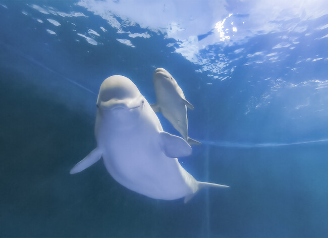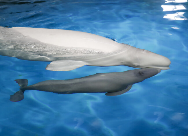 まっ白で背ビレのない体と大きく柔らかい頭部が特徴のベルーガは、当館が日本で初めて飼育展示を開始した1976年より、その澄んだ声で多くのお客様に愛されてきました。日本でベルーガを飼育している水族館は4館のみで、国内での繁殖は大変珍しく、今回の出産は日本13例目となります。当館では2021年に誕生した2頭の赤ちゃんに続いて3頭目の赤ちゃん誕生となりました。