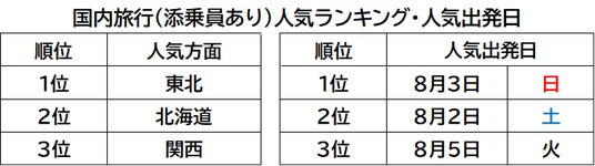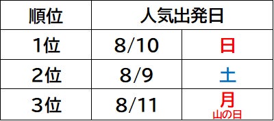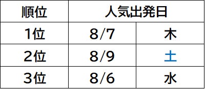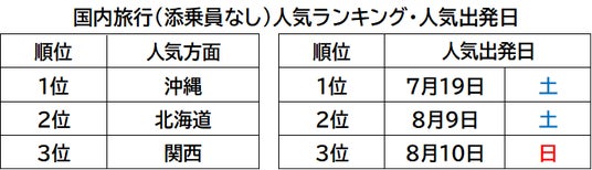 出発日は、7月19日(土)発が1番人気が高く、続いて8月9日(土)と3連休を利用した1泊または2泊での旅行が人気となっています。