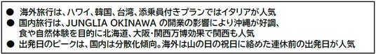 国内旅行(添乗員なし)の全方面合計では、沖縄が1位となりました。ホテルのラインナップや現地観光プランが豊富であることに加え、7月25日(金)開業予定のテーマパーク「JUNGLIA OKINAWA」 の影響もみられ、沖縄本島の人気が高くなっています。また、沖縄を目的地とした予約の約80%が家族旅行となっています。