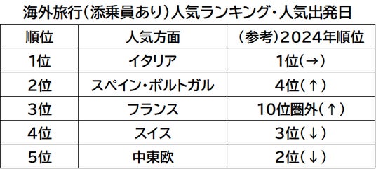 海外旅行(添乗員あり)の全方面合計では、昨年に続きイタリアが1位となりました。昨年はパリ2024オリンピック・パラリンピックの開催で渡航が難しかったフランスが上位にランクインしています。参加形態は「ファミリー」37%、「夫婦」34%、「ハネムーン」17%となっており、全体傾向として3世代での旅行が増えています。