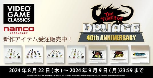株式会社バンダイナムコエンターテインメントは、1984年にアーケードで稼働開始したアクションRPG「ドルアーガの塔」40周年施策の第2弾として、8月22日(木)11時00分より、自社エンタメコマースサイト「ASOBI STORE」にて、新作グッズの受注販売を開始しました。※「ドルアーガの塔」40周年:2024年7月20日(土)~2025年7月19日(土)