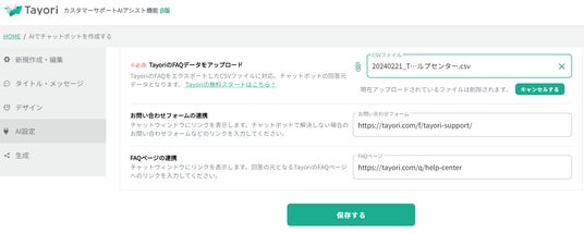 - 「AI設定」でFAQデータのアップロードや、問い合わせ/FAQページの連携
