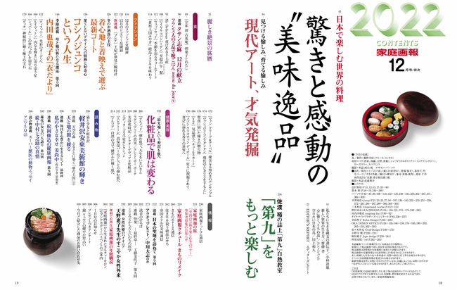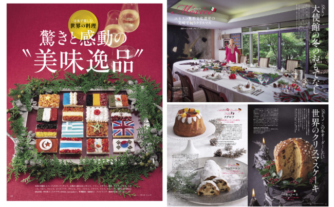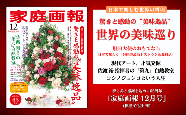 株式会社世界文化社は、『家庭画報 12月号』を11月1日(火)に発売しました。今号は、日本で楽しむ世界の料理「驚きと感動の“美味逸品”」と題し、駐日大使の冬のおもてなしや世界のクリスマスケーキ、日本で味わう各国の最高レストランを紹介。日本にいながら、世界の美味巡りを楽しめる内容になっています。