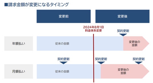 請求金額が変更になるタイミングは、2024年8月1日以降の契約更新時となります。