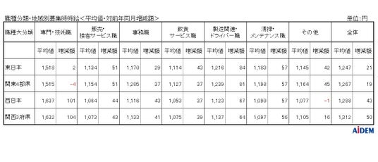 職種大分類別の平均時給は、「専門・技術職」1,518円(前年同月比2円増)、「製造関連・ドライバー職」1,216円(同84円増)、「清掃・メンテナンス職」1,183円(同57円増)、「事務職」1,170円(同29円増)、「販売・接客サービス職」1,134円(同51円増)、「飲食サービス職」1,114円(同43円増)の順で、前年同月比で全ての職種がプラスとなった。