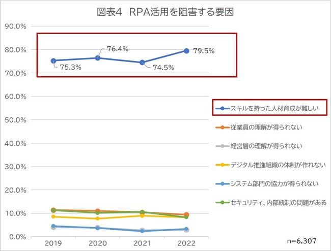 複数部門や全社展開を図る上で新たに課題として表面化してきているのが、シナリオの管理・運用体制に関する問題です。特に、総務や経理などの業務部門、営業などの利用部門が自らシナリオ作成しているケースにおいて、「シナリオの管理・運用が難しい」、「シナリオが停止した時の対応が難しい」と回答する割合が増えています(図表3)。また、回答者の約8割が、「RPAスキルを有する人材育成が難しい」ことを、RPA利用を阻む要因として選択しています(図表4)。