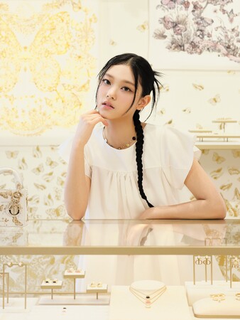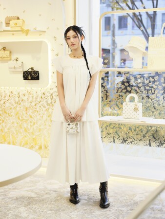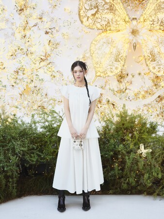 HAERINはマリア・グラツィア・キウリによる2024年クルーズ コレクションからホワイトのウィピルブラウスにミディ丈のスカート、メキシカンスタイルの「ディオール ウエスト」ヒールブーツにホワイト&ゴールドトーンで描かれた「バタフライ ゾディアック」モチーフの「レディ ディオール」マイクロバッグを携え、ディオール ファイン ジュエリーからイエローゴールドとホワイトゴールドにダイヤモンド、マザー オブ パール、オニキスがあしらわれたネックレス、ブレスレット、リングを合わせたホリデールックで東京でのひとときを楽しみました。