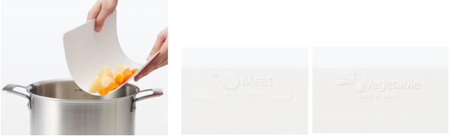 薄く、やわらかい素材なので、曲げて使用し、切った食材を直接鍋に移せます。野菜、肉・魚など両面で使い分けができ、識別しやすいよう刻印を入れています。銀イオンの抗菌加工をしているので衛生的です。