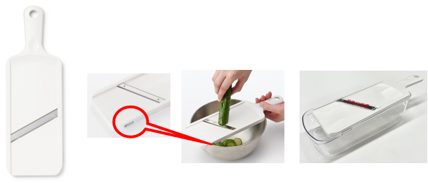 押しても引いてもカットできるよう両刃に仕立て、楽に素早くスライスできます。お手持ちのボールなどに先端の溝を引っかけて使用できます。また、同日発売の「軽い力でおろせるおろし器」の受け皿を共通でご使用いただけます。