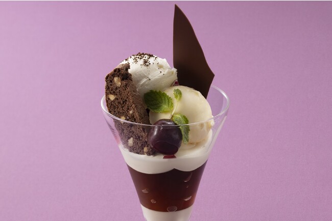 コーヒー味のパンナコッタやゼリーにティラミスクリームを合わせた大人な味わいのパフェ。2種のアイスクリームで味の変化もお愉しみください。