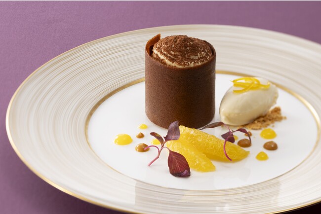 筒状のココアラングドシャの中に、エスプレッソを染み込ませたアーモンド生地と、マスカルポーネクリームのエスプーマで仕立てたティラミスを忍ばせました。甘いキャラメルアイスクリームとともにお愉しみください。
