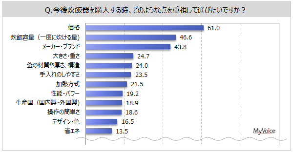 炊飯器購入時の重視点は(複数回答)、「価格」が61.0%、「炊飯容量」「メーカー・ブランド」が各40%台です。