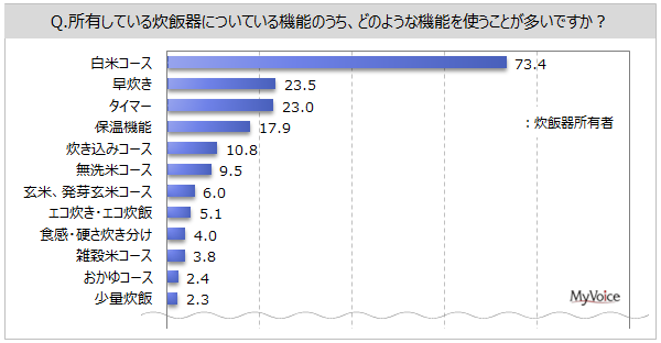 炊飯器で利用する機能・メニューは(複数回答)、「白米コース」が炊飯器所有者の73.4%、「早炊き」「タイマー」が各2割強、「保温機能」「炊き込みコース」が各10%台です。『アイリスオーヤマ』主利用者では、「銘柄炊き分け」の比率がやや高くなっています。