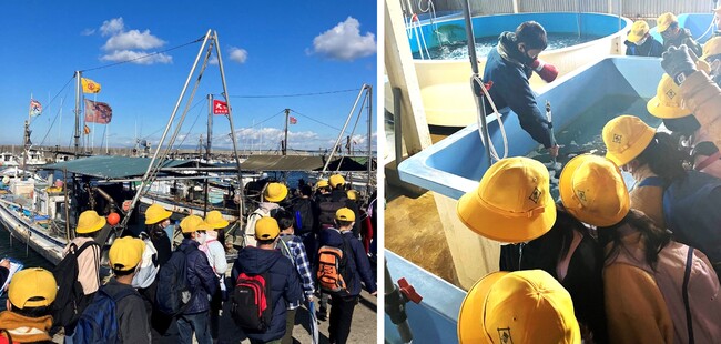 “陸養”プロジェクト実行委員会は、陸上養殖体験と平行し、 身近な海とそこに暮らす生き物や、海とつながる環境・生態系全体について学ぶ特別授業を展開しており、2022年12月6日(火)に岡田浦漁港見学を実施しました。