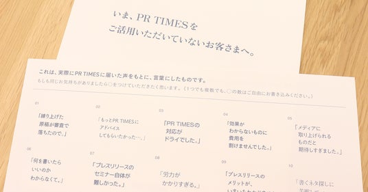 PR TIMESは現在9万社を超えるお客様にご利用いただいており、2007年のサービス開始以降多くのお客さまに広報・PR活動のパートナーに選んでいただいていることを嬉しく感じています。その一方、私たちのご案内や伴走の不足によって、寄せていただいたご期待に応じることができなかったことも多くありました。ご期待に沿えることが出来なかった点にしっかりと向き合い、今後に向けて改めてお声を聞かせていただきたいと思いながらも、それは当社の勝手な都合です。そのような中で、少しでもお詫びの気持ちと信頼回復に向けて再び伴走させていただきたいという想いが伝わるよう、細部までこだわり制作いたしました。このような形で評価いただけたのは、ひとえにお客さまのおかげです。DMを受け取っていただいたお客さま、DMをきっかけに再度当社とやり取りくださったお客さまに、心より感謝しております。