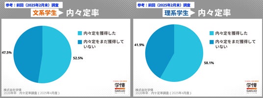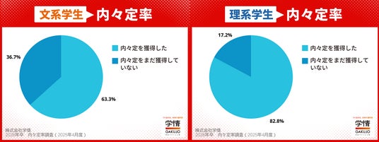 株式会社学情(本社:東京都中央区)は、2026年3月卒業(修了)予定の大学生・大学院生を対象に、就職活動に関するインターネットアンケートを実施。今回は「内々定の獲得状況」をテーマに調査しました。2025年3月末時点の内々定獲得率は「69.7%」。前月から+15.4ポイントと3月1日の採用広報解禁から1カ月で内々定出しが一気に進み、ほぼ7割となりました。同時期の調査で過去最高値。2025年卒より1カ月早いペースで内々定出しが進んでいます。文理別では、理系が「82.8%」と早くも8割超に。文系も「63.3%」と6割を超えました。一方で“就職活動をしている”学生は「63.3%」に急落。その分“内々定を獲得し就活を終了”した学生が「31.9%」に増え、すでに3人に1人が就活を終えたことになります。