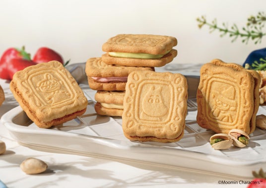 コク豊かでミルキーなホワイトソイショコラに森の実りを練り込みました。ムーミン柄は、クルミペーストを練りこんだ香ばしいクルミ味。リトルミイ柄は、いちごのフリーズドライを練りこんだ甘酸っぱいストロベリー味。スナフキン柄は、ピスタチオペーストを練りこんだ芳醇な香りのピスタチオ味。北欧の森から着想を得たサクサクおいしい分厚いサンドです。
