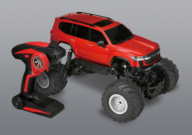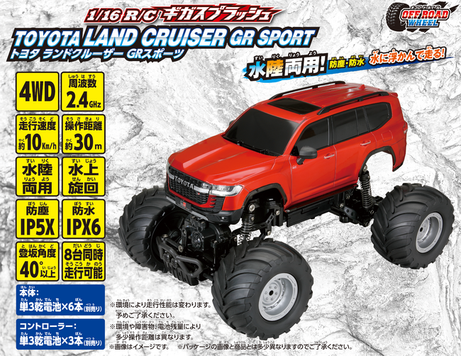 大人気のSUV「トヨタ ランドクルーザーGR SPORT」を1/16というビッグサイズでモデル化し、当社オフロードホイールシリーズの最大の魅力である、高い防塵・防水機能と四輪駆動により、地上から水上へ、水上から地上へと環境を気にせず、思いっきり屋外・屋内で楽しむことができる水陸両用のトイラジオコントロールカー(以下、トイR/C)となります。