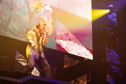 初の試みである「BLACK SONIC」は、なんと昼夜2公演。層厚く轟くバンドの音とシンガーの骨太なボーカルが再び福岡の街を熱くすることに。会場の照明が消え、銃声とサイレンの音。会場は一気に物騒な街の一角へと姿を変え、「ブラックスター」に登場する各チームのメンバーが映像で次々に紹介されると、フロアにはサイリウムの光が揺れた。唸りをあげるギターが疾走するビートと共に鳴り響く「Outsider BLACK SONIC ver」で横一線に並んだ8人のシンガーたちが声をあげる。ケイが、ヒースが、吉野が、リンドウが、マイカが、柘榴が、夜光が、青桐がステージに居並び、歌い上げる姿が浮かんでくる「夜もしっかり救国してやるからな!ついて来いよ!」と声をあげたチームKのケイのシンガー・藤田玲の歌う「During the demise」に黄色いペンライトがステージへと向かって波打つように揺れると、ビートを刻むように吉野のシンガー・齋藤知輝がステージの上段に登場すれば、そんな彼を指し示すようにピンクのライトが向けられた。フロアに背を向けた藤田が両手を広げて光を浴びる。その光が落とされるとスクリーンに「日蝕」の文字。ステージ上段に現れたチームBのヒースのMC・Takuya IDEが「福岡全員、皆殺しだ!」と叫ぶとフロアの光は緑色に染められる。ドラムの強いアタックで生み出されるビートと歌うように鳴るベースの旋律とが饒舌にラップを支え、ギターの音色がヒースのラップを表情豊かに彩る。と、殺伐としたフロアの空気をたった一節で変えてしまったのはチームPのマイカのシンガー・Kradness。マイカの艶と勢いのあるボーカルの情感豊かな様を感じさせた「虹の彼方へ」にピンクのペンライトの光が風のように舞い踊った。虹を見上げていたフロアは夜明けの静けさの中へと連れだされる。「さぁ、福岡夜の部、まだまだ盛り上がっていきましょう!」と声をあげたチームCの柘榴の歌声を担うしゃけみーが花をひらひらと舞わせるように腕を揺らすと紫に染められたフロアはまさに「Purple Dawn」の名のままに深淵の夜明けの色を帯びた。
