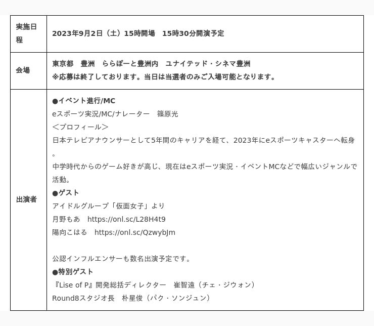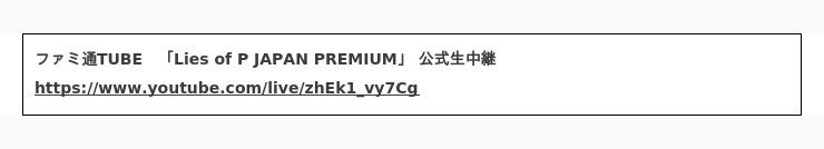 株式会社NEOWIZ (本社:韓国 京畿道城南市、共同代表:金 承徹(キム・スンチョル)/裵 泰根(ベ・テグン)) が開発を進めております『Lies of P』(限定版 2023年9月16日発売/通常版 2023年9月19日発売)の日本限定オフラインイベント「Lies of P JAPAN PREMIUM」が明日、実施となります。これに先駆けて、当日の様子をお届けするファミ通TUBE生配信のURLが公開となりました。