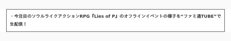 遂に明日開催となりますオフラインイベント「Lies of P JAPAN PREMIUM」ですが、イベント会場の模様は「ファミ通TUBE」にて生配信を実施いたします。生配信をご視聴の方にも楽しんでいただけるプログラムもご用意しております。ぜひご視聴ください。