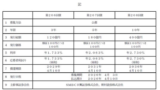 ・発行総額は3年債が120億円、5年債が180億円、10年債が400億円、合計700億円です。