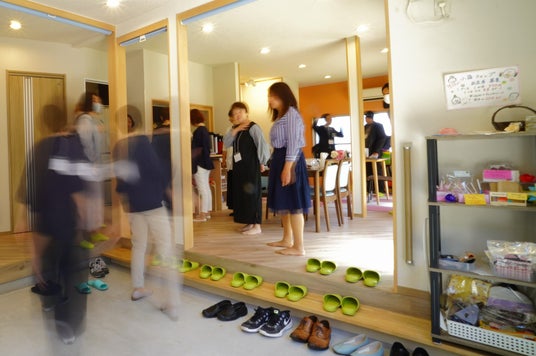 部屋の間にあった引き戸や間仕切り壁を撤去し、見通しの良い大空間にリニューアル。高齢者がお喋りや手仕事をする近くで、子ども達が遊んで過ごせる等、どの世代の人も寛げる、実家の「茶の間」のような居心地の良い場所になりました。