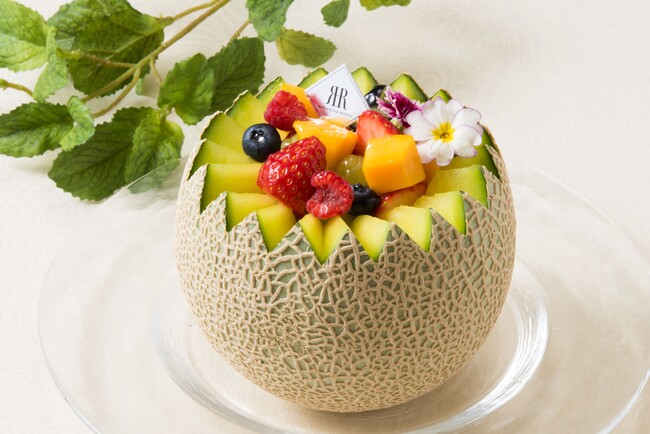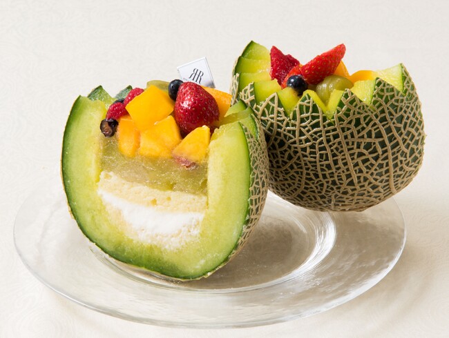 食べ頃の味、品質共に優れたマスクメロンをパティシエが選び、その中身をくり抜いて器にし、生クリームとスポンジ、メロンのジュレを層にしました。