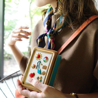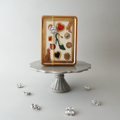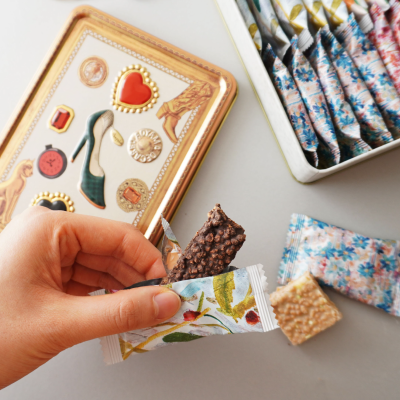 まるで宝石のようにキラキラ輝く世界のヴィンテージボタンが描かれた缶の中には青山デカーボオリジナルのチョコレートを使用し、低糖質ながら濃厚なチョコクランチ(クランベリー・オレンジピール・ピスタチオレモン・黒トリュフ黒胡椒)4種類をお楽しみ頂けます。本物の世界のボタン10種類以上の中からお好きなボタンをお選びいただけます。お菓子を食べた後、世界のボタンはブローチやヘアアクセサリーなどお菓子の缶はジュエリーケースや小物入れなどアフターユースも楽しめます。