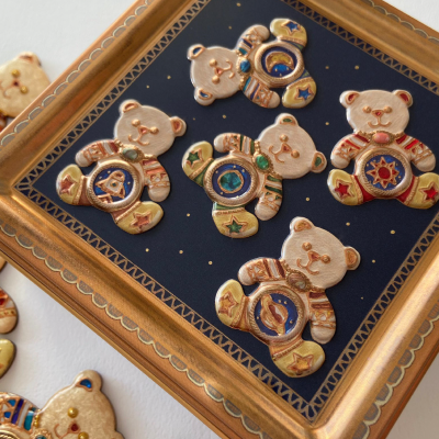 ひとつひとつ手描き、まるでステンドグラスのようにキラキラ輝く「ブローチ」。