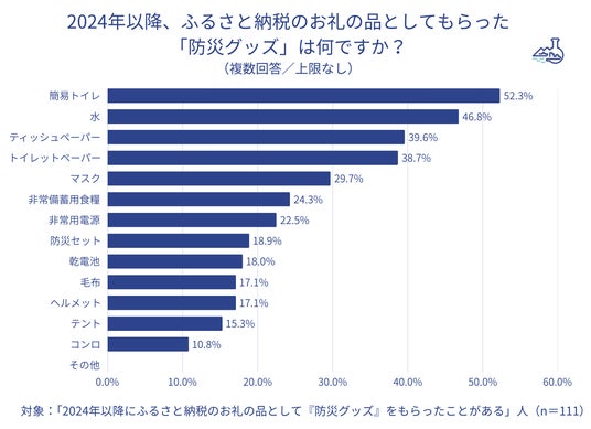 - お礼の品として受け取った防災グッズは、「簡易トイレ」が最多で52.3%、続いて「水」(46.8%)、「ティッシュペーパー」(39.6%)、「トイレットペーパー」(38.7%)となった。