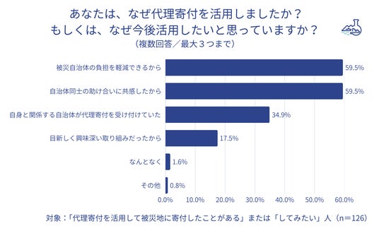 - 代理寄付を活用した理由としては「被災自治体の負担を軽減できるから」が59.5%、同数で「自治体同士の助け合いに共感したから」が59.5%となった。