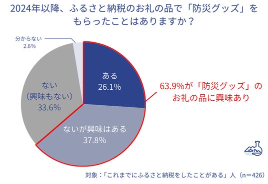 - 2024年以降、ふるさと納税のお礼の品として防災グッズを受け取ったことが「ある」という回答が26.1%、「ないが興味はある」が37.8%となった。ふるさと納税で防災グッズをもらうことを検討したきっかけは「能登半島地震」が53.2%、僅差で「南海トラフ地震臨時情報」が52.3%と回答。