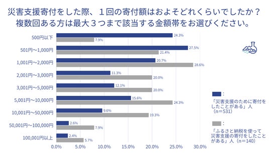 - 1回当たりの寄付額は「501円~1,000円以下」が最多の27.5%。次いで「500円以下」が24.3%、「1,001円~2,000円以下」が20.7%。また、ふるさと納税での災害支援寄付経験者は、1回当たりの寄付額が比較的高い傾向にあり、「1,001円~2,000円以下」が最多の28.6%、次いで「5,001円~10,000円以下」が24.3%となった。