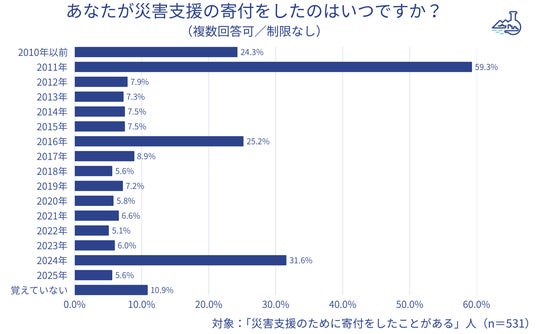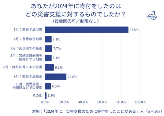 1) 災害支援寄付経験者が52.1%と半数以上。2024年の寄付で最も多かったのは能登半島地震
