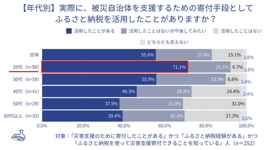 - ふるさと納税で被災自治体に寄付できることを知っているのは全体の47.4%。災害支援寄付経験がある人に絞ると、実際にふるさと納税で寄付したことがある人は55.6%で、「ふるさと納税で寄付したことはないが今後は活用してみたい」と答えた人は27.4%。